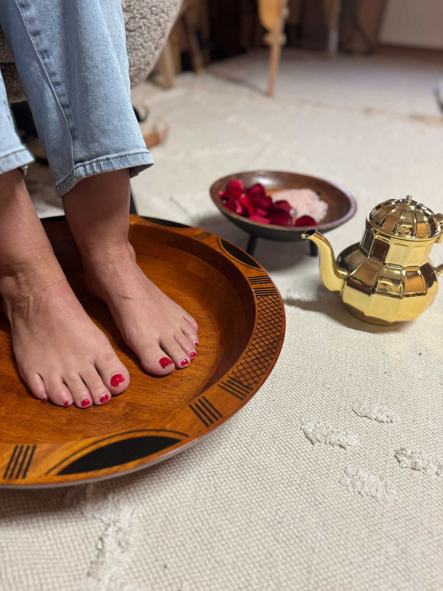Ceremoniëel voetenbad met Himalayazout, rozenblaadjes of rozenknoppen voor aarding en zachte opening